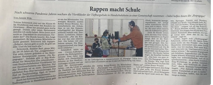 An der Tiefburgschule wurde es im Schuljahr 21/22 zeitweise noch etwas lebendiger und lauter als sonst - der Grund: Die 4. Klassen hatten Besuch von den Rapagogen .Beim Rap-Projekt sprachen die Schülerinnen und Schüler darüber, was sie gerade bewegt und schufen mit viel Motivation einen eigenen Song für ihre Klasse. Mit Mut und Selbstbewusstsein sangen sie eigenständige Liedzeilen und zeigten stolz, was sie gelernt hatten.